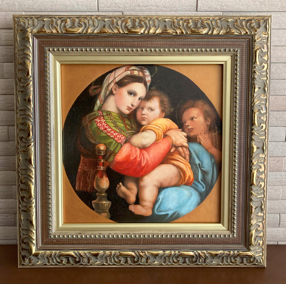 聖母子像の名手ラファエロの油彩画の模写です。 原画は板に油彩で円形ですが、正方形の木製パネルに模写しました。 聖母子を描いた円形部分は油彩ですが、四隅の赤金の部分はアクリル絵の具です。 額に入っているので見えませんが、パネルの側面と裏側は、 アクリル絵の具で緑色に塗りました。 絵のサイズ:246×246×20mm 額縁サイズ:375×375×55mm 表面のアクリル板は外して撮影しております。 箱付きです。 既製の額縁は合わなかったので、額縁屋さんに作ってもらいました。 派手にはなりすぎず、ゴージャスな感じになったと思います。 ルネサンス絵画がお好きで、印刷物では物足りないという方にお勧めです。